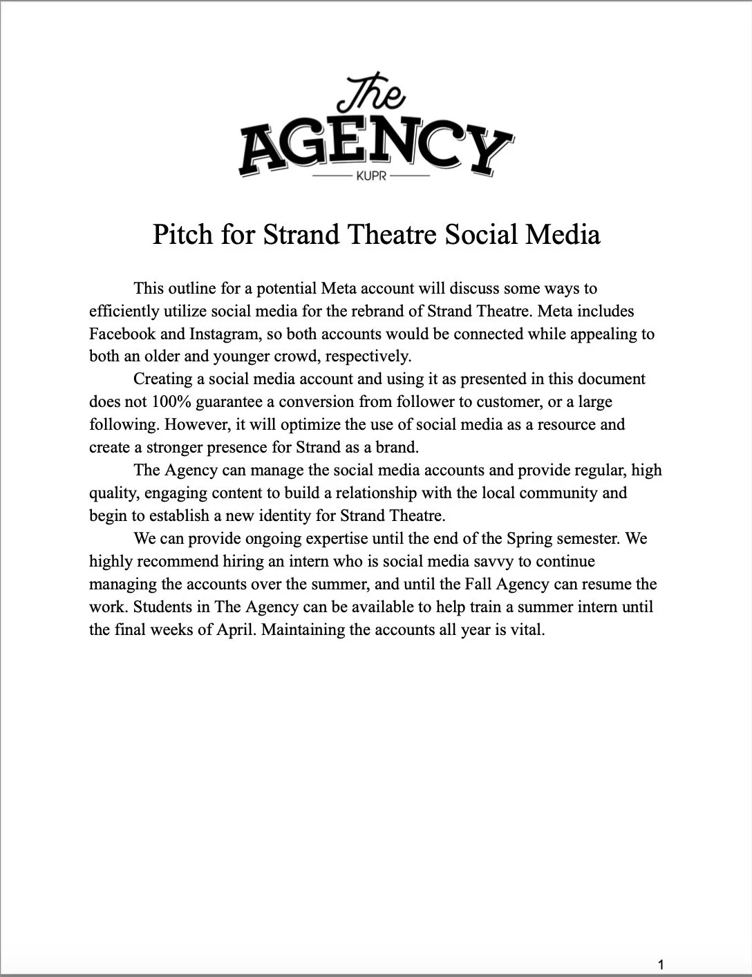 This was a collaborative project I worked on with peers in the Agency. Our goal for this was to come up with a social media plan to present to the board. We wanted to give as much background as possible of why we made the decisions we did for people who aren’t as advanced or knowledgeable about social media so they could understand why we chose to plan it the way we did. We came up with fundraising ideas as well as making Instagram mockups for the KCP board so they could visually see our ideas and what they would look like to our followers rather than just written word.